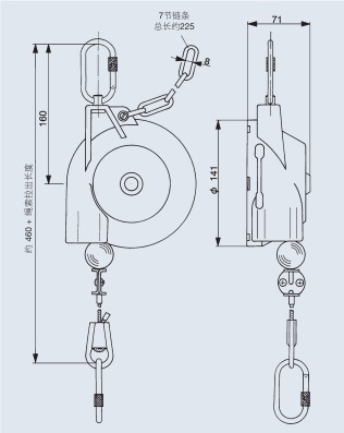 绳索:卷绳筒高强度钢绳,带弹性绳索缩回限制装置和用来吊挂物体的螺旋弹簧保险钩。绳索长度可通过一个绳锁进行无级调节。通过一个绳夹可无级缩短工作行程。