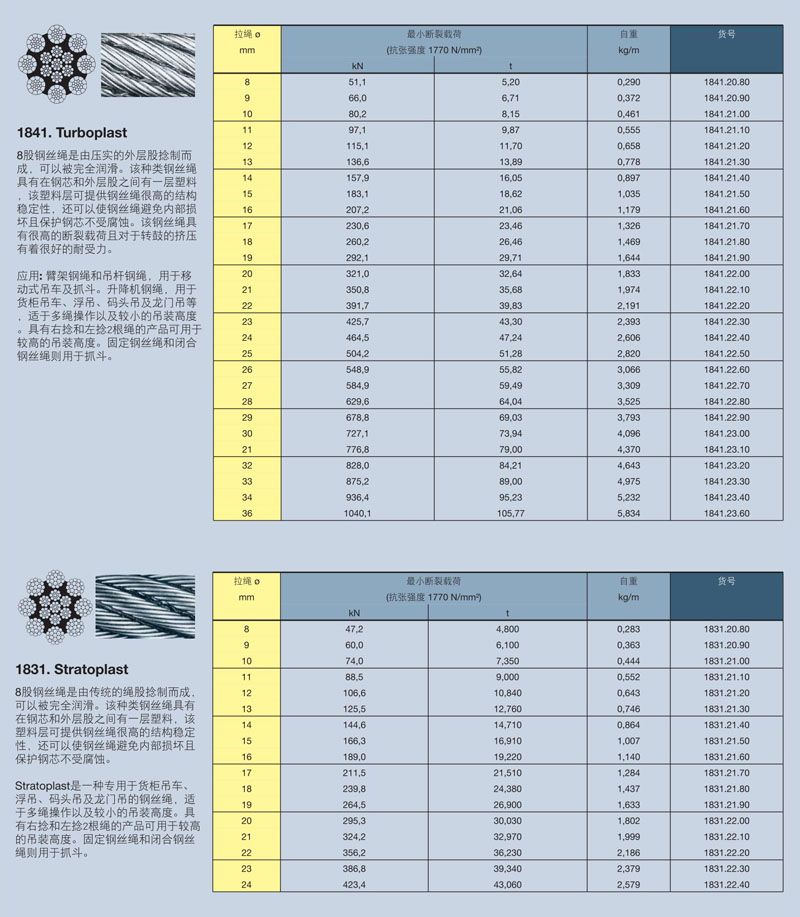 塑料层可提供钢丝绳很高的结构稳定性,还可以使钢丝绳避免内部损坏且保护钢芯不受腐蚀。Stratoplast是一种专用于货柜吊车、浮吊、码头吊及龙门吊的钢丝绳,适于多绳操作以及较小的吊装高度。具有右捻和左捻2根绳的产品可用于较高的吊装高度。固定钢丝绳和闭合钢丝绳则用于抓斗。