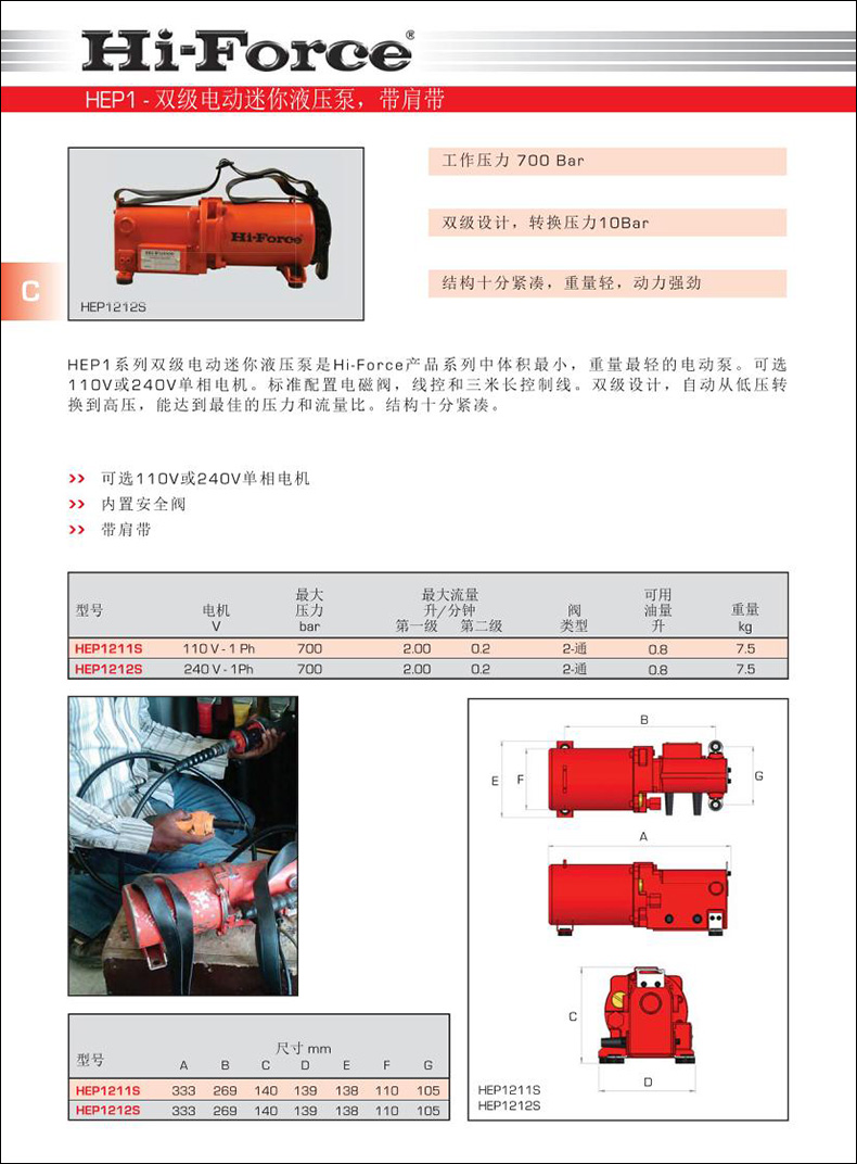H E P 1 系列双级电动迷你液压泵是H i - F o r c e 产品系列中体积小款式,重量轻的电动泵。可选1 1 0 V 或2 4 0 V 单相电机。标准配置电磁阀,线控和三米长控制线。双级设计,自动从低压转换到高压,能达到最佳的压力和流量比。结构十分紧凑。