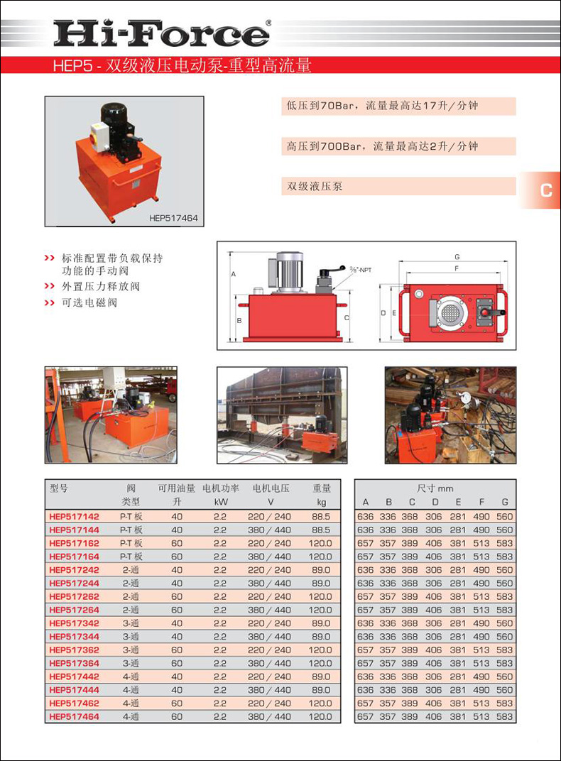 HEP103系列双级液压电动泵适用于多种应用场合,可选110V或240V单相电机。可选手动方向控制阀或电磁方向控制阀,有2通,3通或4通可供选择,还可以选额外的阀功能,如中位常开,中位常闭和阀锁紧等。工作压力可达7 0 0 B a r ,自动从低压转换到高压。标准配置甘油填充压力表,出厂前装满的可用油量4升的油箱,油箱带可视油位计。还带有一体式手柄,方便运输到应用地点。本泵用途广泛,结构紧凑,重量轻。